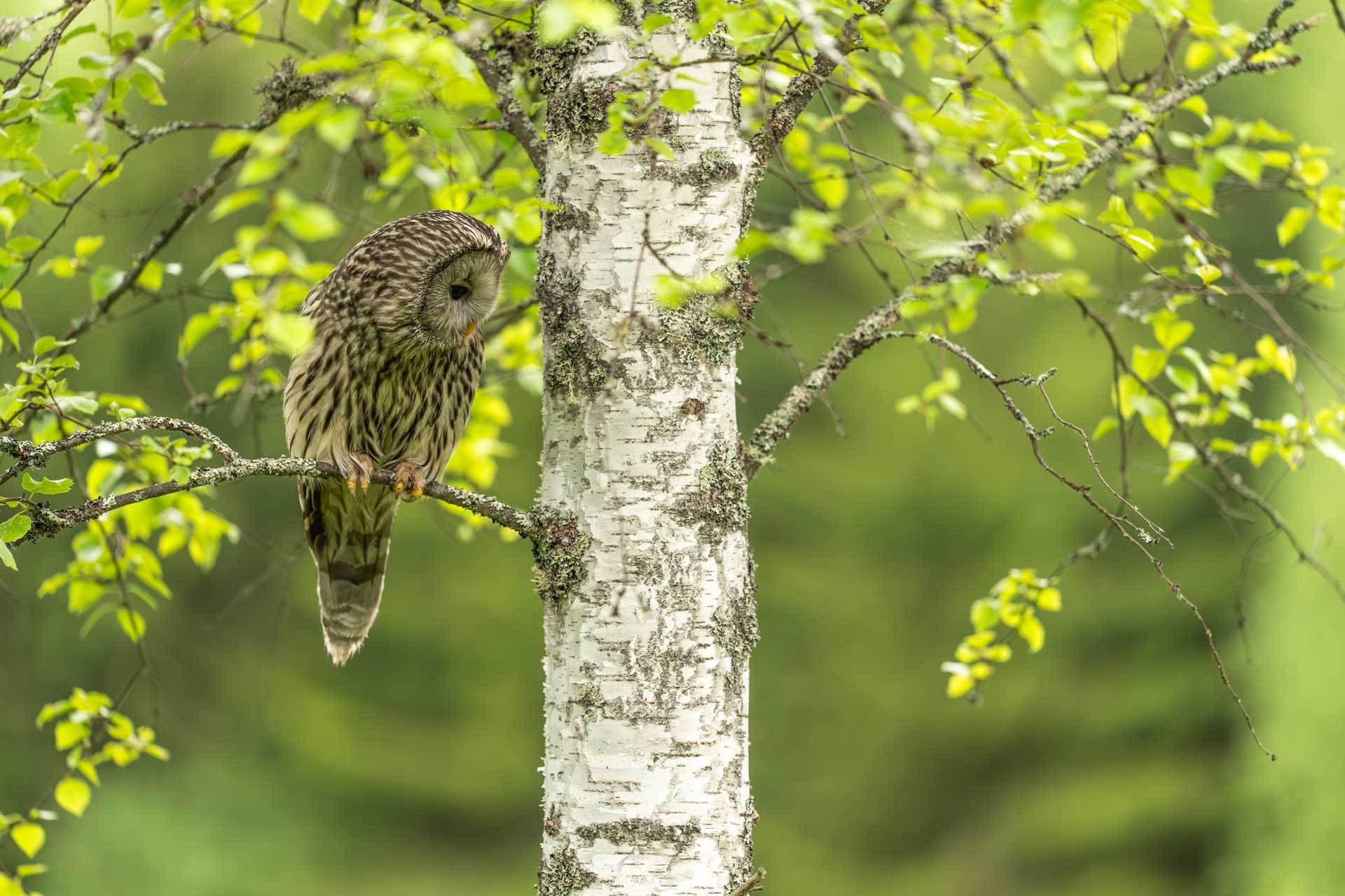 „Zkusíme to projít ještě jednou nahoru a dolu“. Po zhruba 200 metrech na větvičce břízy pár metrů od nás seděl krásný Puštík bělavý. Nerušeně jsme se vzdálili, nachystali fototechniku a v tichosti pozorovali a fotografovali tuto impozantní sovu. Naše přítomnost jí vůbec nevadila. Zajímal jí hraboš pod stromem. Nerušeně lovil a předváděl nám svojí loveckou dovednost. Ne každý pokus byl úspěšný, neboť travní porost byl už vzrostlý. O to déle jsme ho mohli pozorovat. Úspěšný úlovek odnesl do hnízda a my se mohli jít taky najíst.